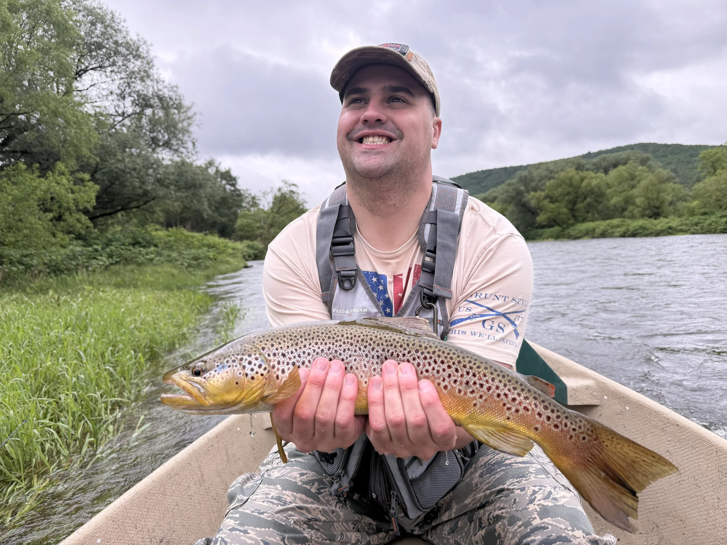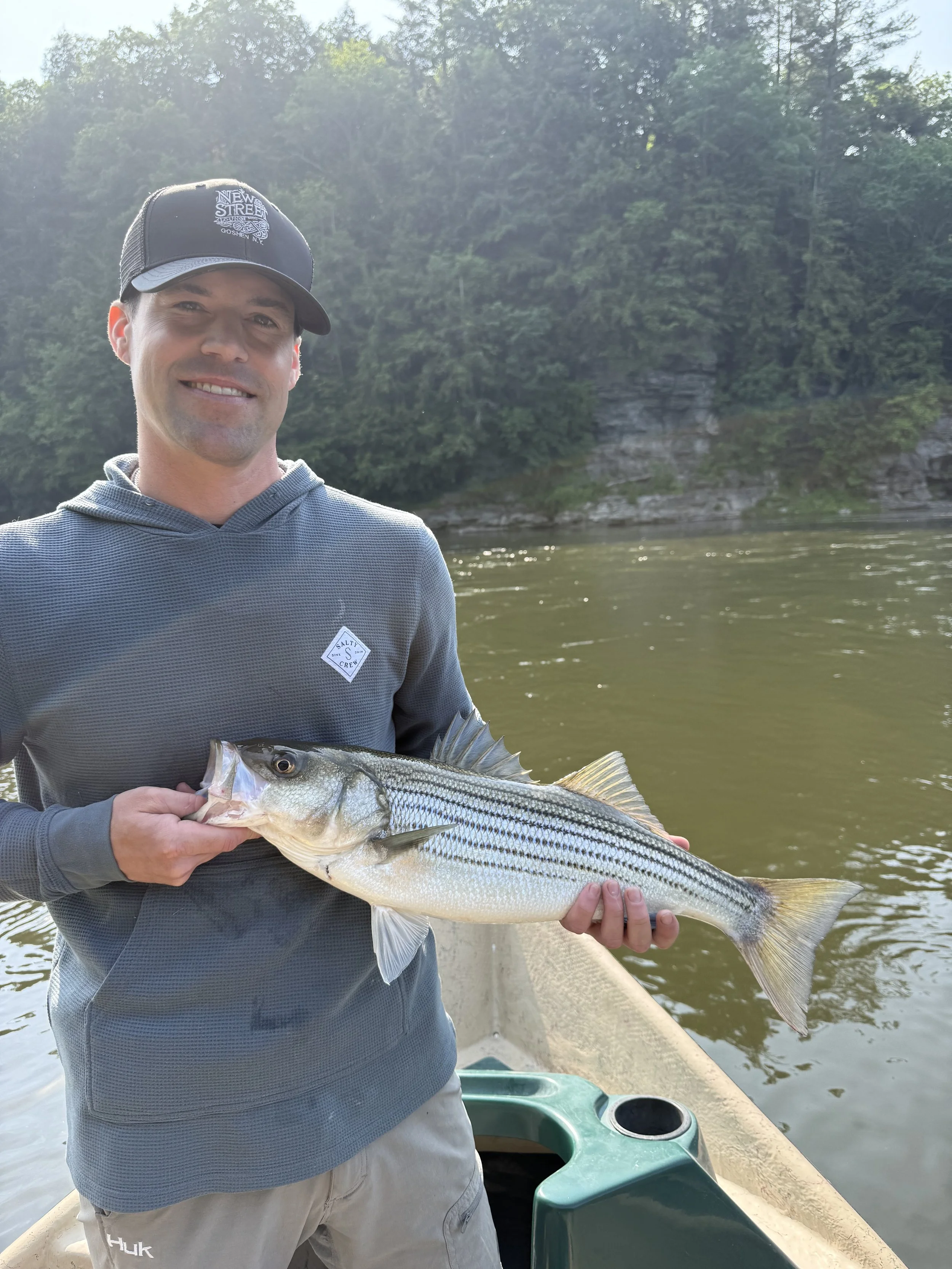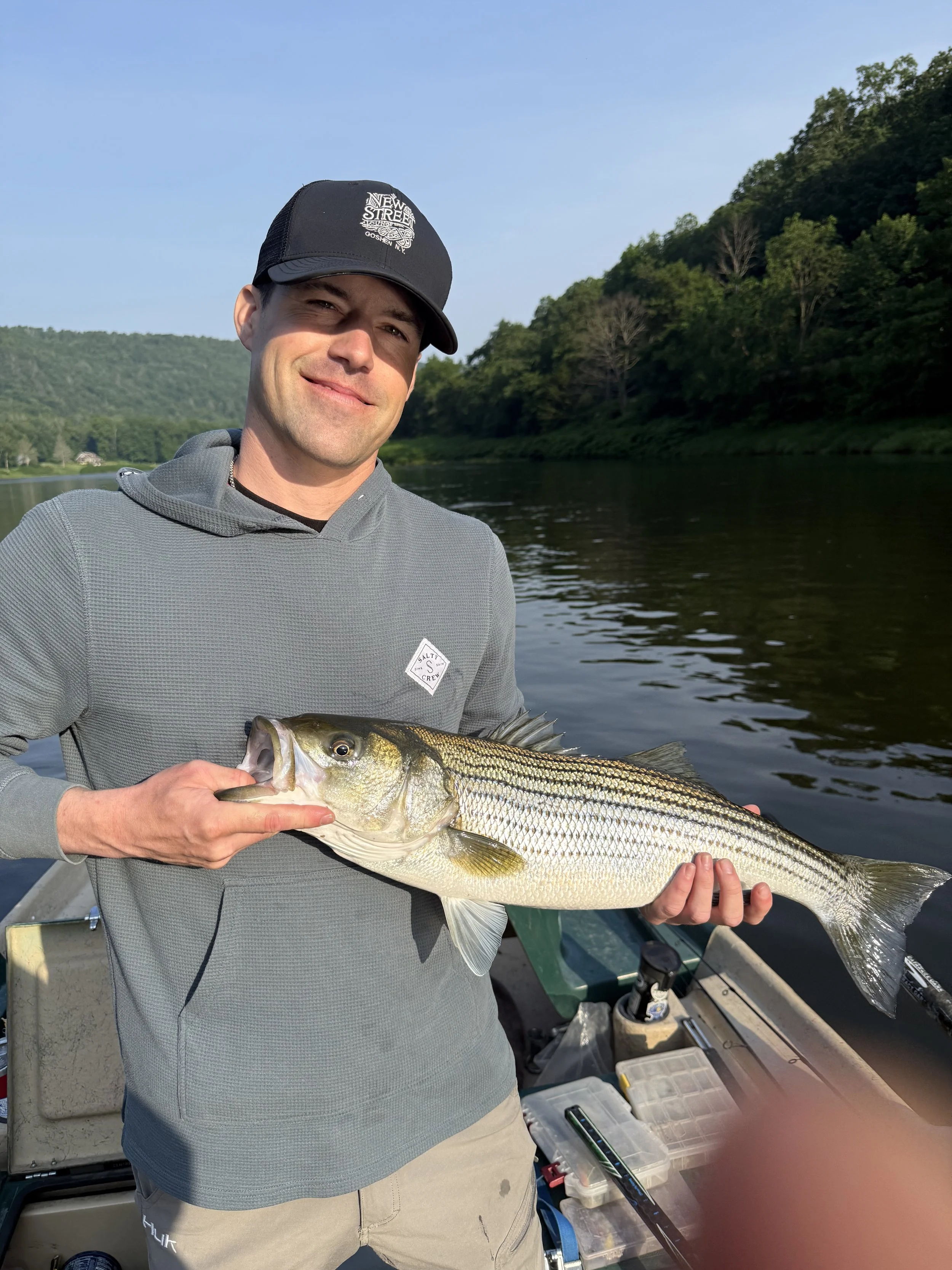 I don't think we had even taken a picture of the Striper yet, and I hear Matty say he's getting bit. I look up at his rod, and see him set the hook. Now the fish on his line immediately took off on a crazy long distance run. Unlike what most stripers do, I internally thought, “I wonder what that is” . I didn't think much of it as I was dealing with the fish I had just caught and revelling in my own sense of glory. Matty is a guy with a jovial demeanor, and an insane amount of excitement when it comes to successful fishing operations. So as he catches a glance of the fish he confirms it is quite large, but still thought it was a Striped bass, our target species. Upon second glance, he sees spots on its side, and yells, “It’s a trout! This is the biggest trout we’ve ever seen” Paul and I still hadn't seen it, and were now intrigued, so we stood up to watch the battle. As the seasoned veteran angler Matty is, he fought this fish on a medium action Ugly Stik, with 8lb test line, and handled it like a professional angler. Anchor rope and boat angles can be detrimental to battling a big fish on a light line, but knowing how to do it can yield success. As the fish came back around, we were all losing our minds at the size of this river trout. The average size brown trout in this river is 16-19” with many in the 19-23” range but seemingly very few in the 25-30” size class, as is typical in most river fisheries.