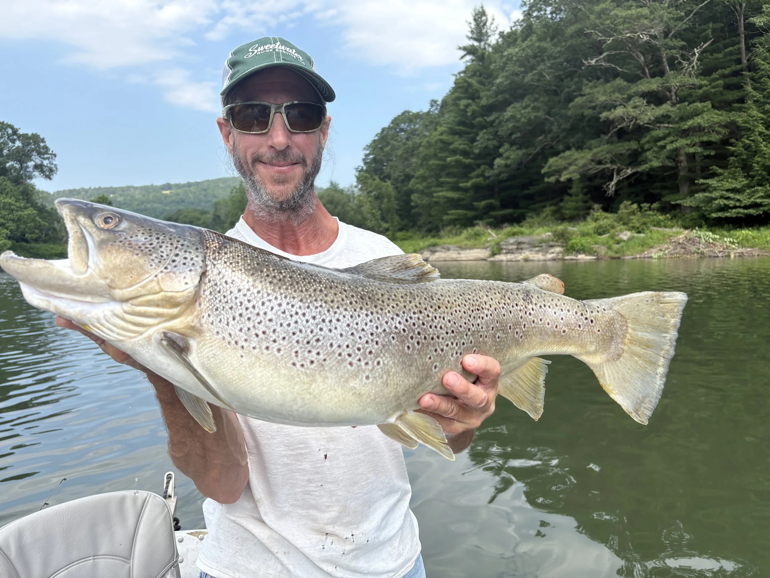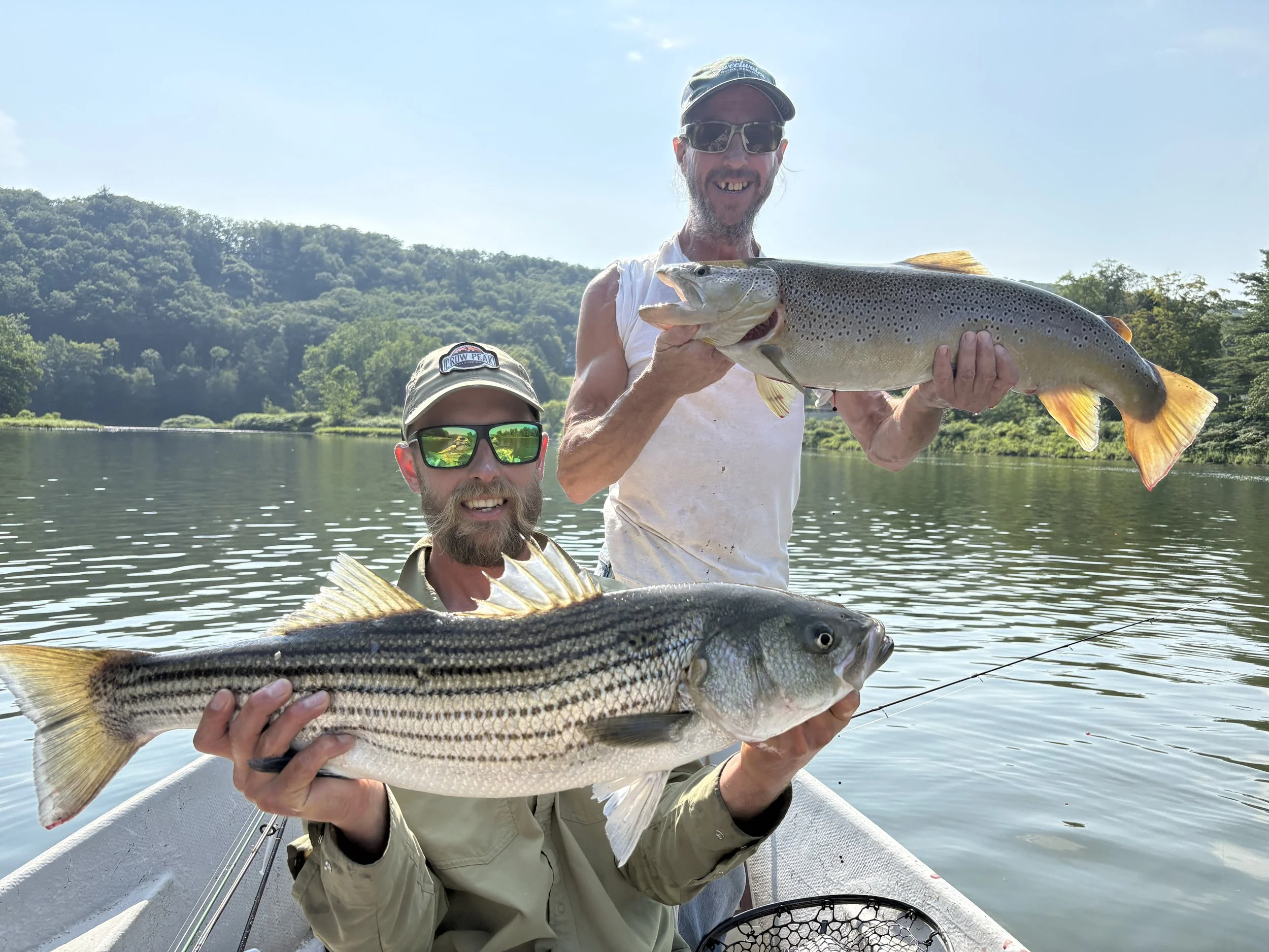In about fifteen minutes two 30” fish were netted on my older original drift boat, Paul on the oars and net, Evan with the striper, and Matty with the brown trout. Both personal bests for Matty and I, and that brown trout was a true river monster for the fishery here. It broke the previous Sweetwater Guide Service record for brown trout by 3” held since 2007. This fishing day will go down in history as one of the best.